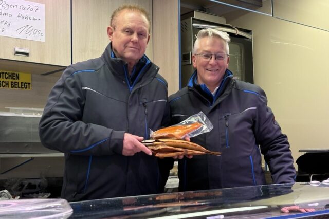 Dieter Schröter (links) und Uwe Walczak verkaufen seit zwölf Jahren auf dem Dortmunder Wochenmarkt Fisch-Delikatessen. Nun verabschieden sie sich. © Tim Ruben Weimer
