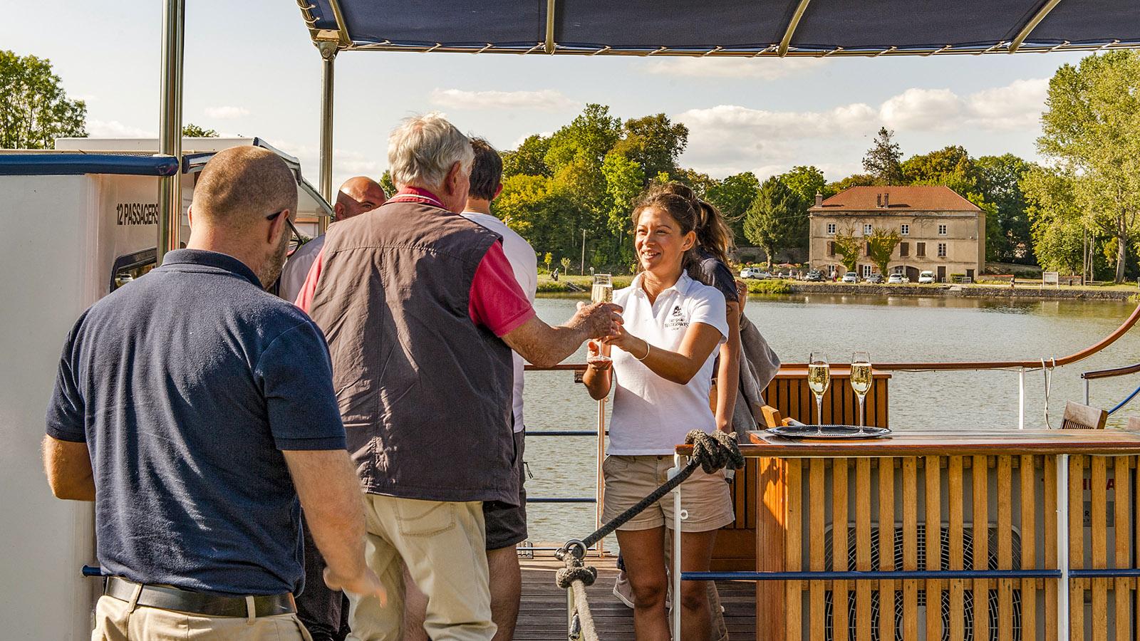 Zur Begrüßung an Bord gibt es Champagner. Foto: Hilke Maunder