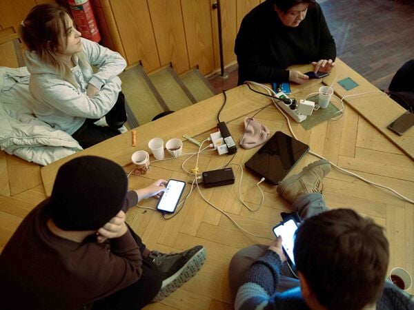 Hilfesuchende laden Telefone und Tablets im Rathaus Zehlendorf auf.