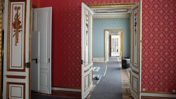 In einem Raum des Schlosses Ludwigslust steht eine Flügeltür offen, so dass in den nächsten Raum geblickt werden kann.