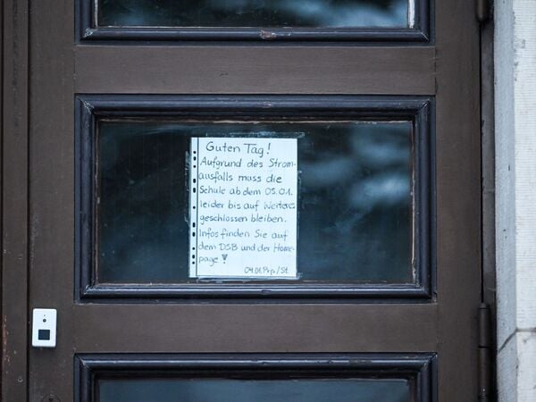An der Tür eines Gymnasiums steht auf einem Info-Zettel „Guten Tag aufgrund des Stromausfalls muss die Schule ab dem 5. Januar leider bis auf Weiteres geschlossen bleiben. Infos finden Sie auf dem DSB und der Homepage!“.