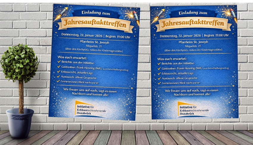 Mit ihrem Jahresauftakttreffen möchte die Initiative selbstbewusst und voller Elan ins neue Jahr starten. Dabei soll zugleich ein kurzer Einblick in die Entwicklungen aus 2025 sowie eine Einordnung der bisherigen Arbeit rund um das Thema Erbbaurecht gegeben werden.
