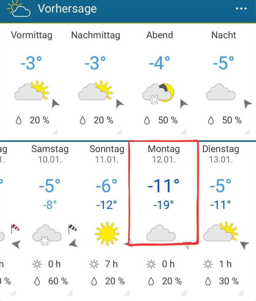 Wenige Stunden später folgt direkt die Entwarnung: Ein Mitarbeiter erklärt, dass man die Vorhersage bereits auf minus 14 Grad reduziert habe, und zwar für die Nacht. Tagsüber sollen es immerhin minus 8 Grad werden. Andere Apps prophezeien allerdings weniger kaltes Wetter.