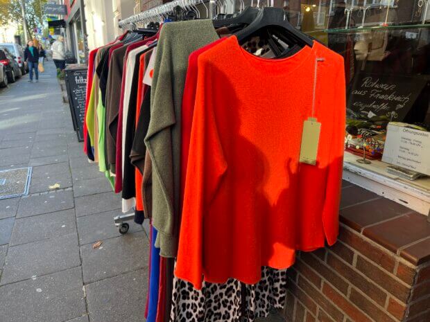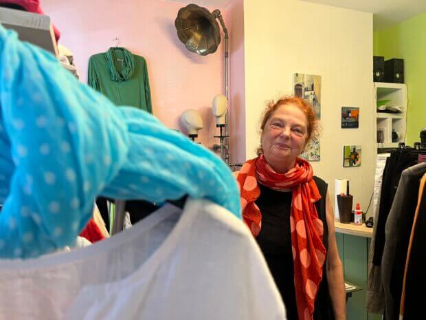 Im Spätherbst 2020 war es dann soweit: Gabriele Thelen eröffnete ihren kleinen Laden, in dem sie farbenfrohe, lässige, meist one size Klamotten verkauft, die sie in kleiner Stückzahl und oft in Italien einkauft. Kleider, Oberteile, Röcke und Hosen, alle mit besonderem Detail, Schnitt, Farbgebung oder Material. Aber auch Schmuck eines Herstellers in Polen bietet sie an: „Und der ist von erstaunlicher Qualität“, wie sie findet. Denn das ist ihr neben den bezahlbaren Preisen wichtig, fast fashion aus Fernost ist nicht ihr Ding. Kurz nach der Eröffnung und dem vorsichtigen Aufbau einer Kundschaft, holte sie der Weihnachts-Lockdown 2020 ein. Ab dem 16. Dezember war damals wieder alles außer der Lebensmittelgeschäfte und Supermärkte geschlossen, ausgerechnet im Weihnachtsgeschäft.