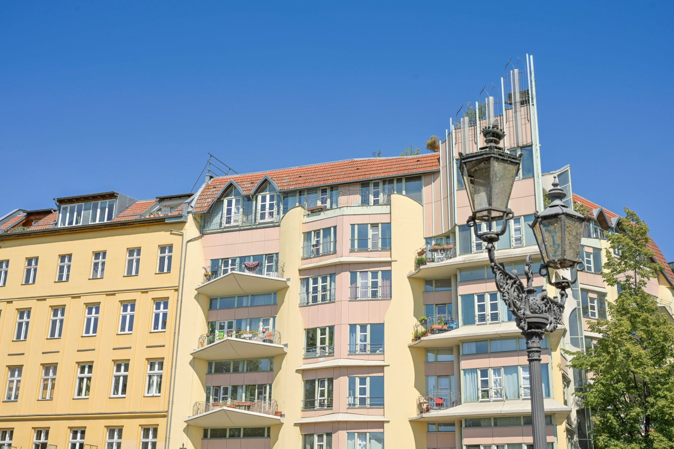 Wenn Pippi Langstrumpf nicht in einer Villa, sondern in einem Mehrfamilienhaus wohnen würde, dann am ehesten in einem der Gebäude von Hinrich und Inken Baller. Zwischen den pastellfarbenen Fassaden, geschwungenen Dächern und verspielten Balkongeländern hätte sich die extrovertierte Romanfigur von Astrid Lindgren sicher wohl gefühlt. Gebäude wie das Wohnhaus direkt an der Admiralbrücke, das auf dem Foto zu sehen ist, entstanden im Rahmen der Internationalen Bauausstellung 84/87. Hinrich und Inken Baller legten viel Wert darauf, dass die Wohnungen keine abgeriegelten Boxen darstellen, sondern möglichst das Innere mit dem Äußeren verbinden: Küchen, die sich zum Wohnraum öffnen, großzügige Balkone, und Säulen, die Teile des Gebäudes tragen, und somit luftige Erdgeschosse hergeben. Wie Hinrich Baller Berlin noch geprägt hat, lest ihr hier.