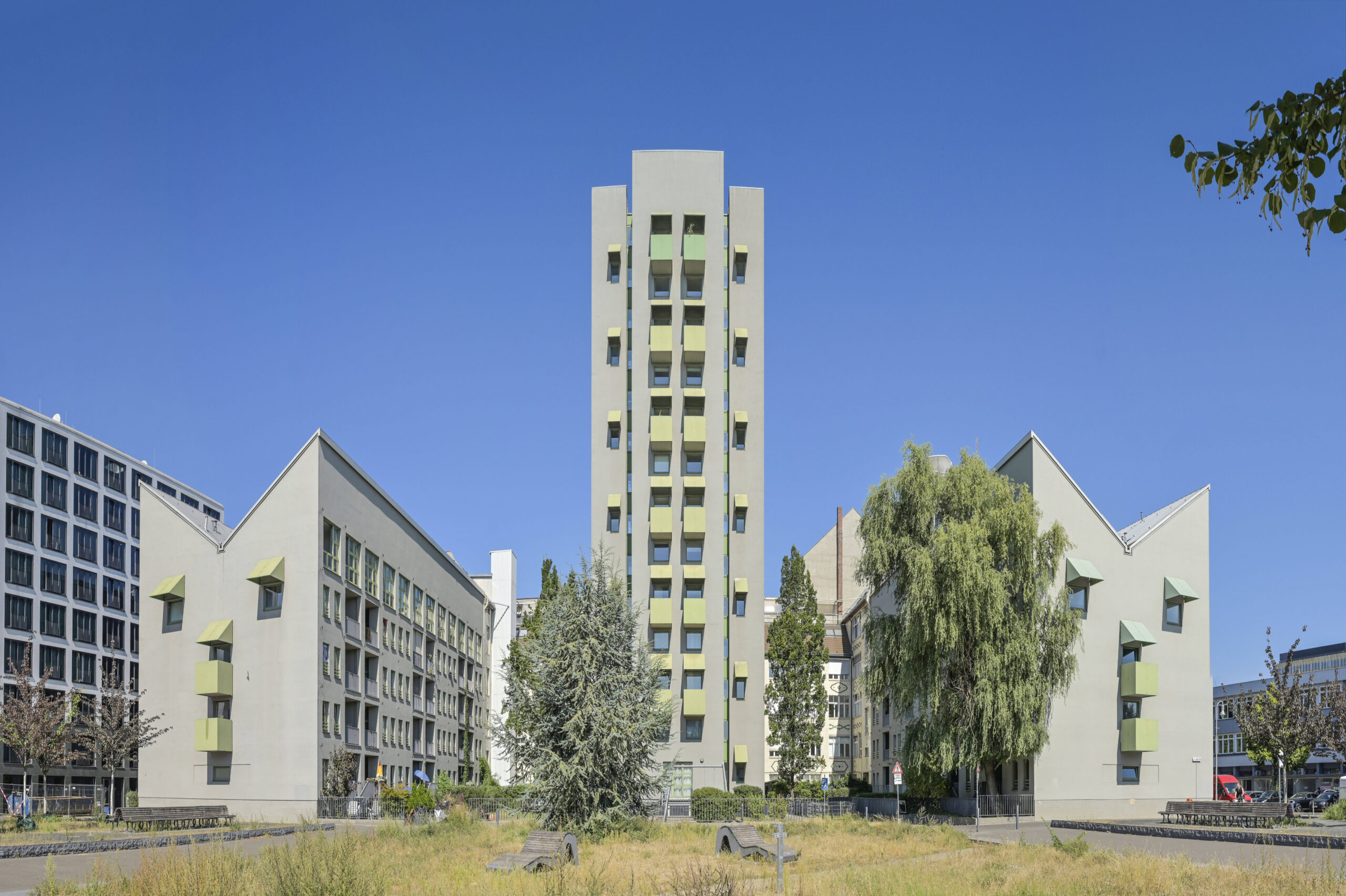 Ursprünglich war der Kreuzberg Tower nämlich als Teil von „Berlin-Masque“ gedacht – einem Projekt, mit dem Hejduk ein Architekturwettbewerb für ein Areal an der Wilhelmstraße gewinnen wollte. Was das mit Venedig zu tun hat? „So wie es für die hochgradig rational-pragmatische Stadt Venedig des 15. Jahrhunderts notwendig war, Masken, Maskenbälle und Messen für ihre Zeit zu schaffen, um zu funktionieren, so scheint es, dass wir, in unserer Zeit, Masken für unsere Zeit schaffen müssen“, sagte Hejduk zum Projekt. Ob die vermenschlichenden Fassaden der Nebenhäuser oder die maskenähnlichen Rolläden – mit dem Kreuzberg Tower konnte Hejduk zumindest einen Teil des Konzeptes verwirklichen. Auch lesenswert: Weitere ungewöhnliche Gebäude in Berlin, die man kennen sollte.