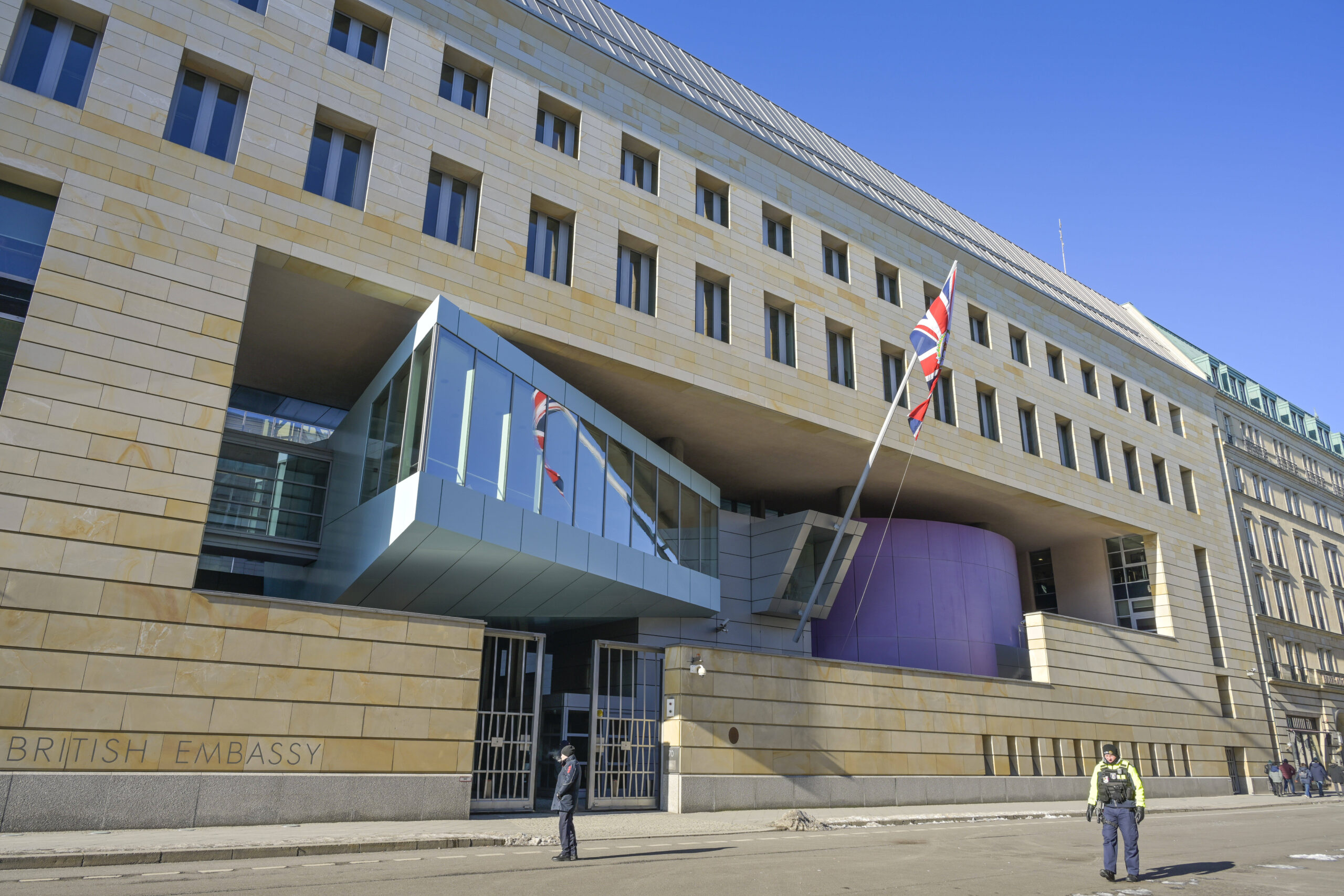 Zusammen mit James Sterling entwarf der ebenfalls aus England stammende Architekt Michael Wilford das WZB – hinterließ aber noch weitere Spuren postmoderner Baukunst in Berlin. 1991 gewann sein Architektenbüro den Wettbewerb um den Neubau der britischen Botschaft an der Wilhelmstraße. In direkter Nachbarschaft zum Hotel Adlon und dem Brandenburger Tor gelegen, vollführt die Botschaft einen tollkühnen Spagat: So reiht sich die äußerste Fassade zwar in die sandsteinfarbene Blockrandbebauung der Umgebung ein, die Mitte des Gebäudes aber wirkt wie aufgeschnitten. Drei Baukörper, einer davon mit großflächiger Verglasung, der andere als lilafarbener, halber Zylinder, ragen aus der Fassade wie buntes Spielzeug aus einem Sandkasten. Wilford habe sich ein „echtes Narrenstück geleistet“, schrieb der „Spiegel“ anlässlich des Besuchs von König Elisabeth II., die den Bau kurz nach der Eröffnung im Jahr 2000 besuchte. Mehr besondere Botschaftsgebäude in Berlin findet ihr hier.