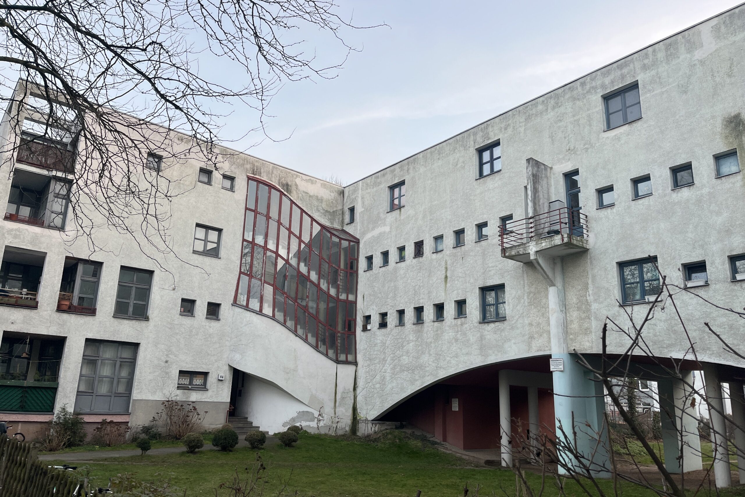 Genau wie Raimund Abraham hat auch der italienische Architekt Paolo Portoghesi ein großes Erbe hinterlassen, allerdings nur zwei Bauten hierzulande realisiert. Eines davon ist ebenfalls Teil der IBA 84/87 und steht im sogenannten „Demonstrationsgebiet Tegel“: eine sandsteinfarbene Villa, deren oberste Stockwerke jeweils von vier Balkonen aufgebrochen sind – und die so den Eindruck erweckt, als wäre sie gevierteilt worden – und als könnte jeden Moment auseinanderbrechen.