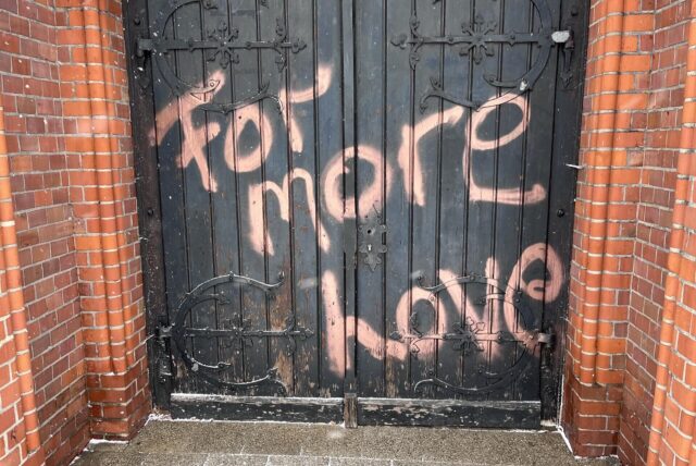 Unbekannte haben den Schriftzug „For more Love“ an die Eingangstüren der Erlöserkirche in Herten-Süd gesprüht. Die Gemeinde verzichtete auf eine Anzeige. © Harald Landgraf