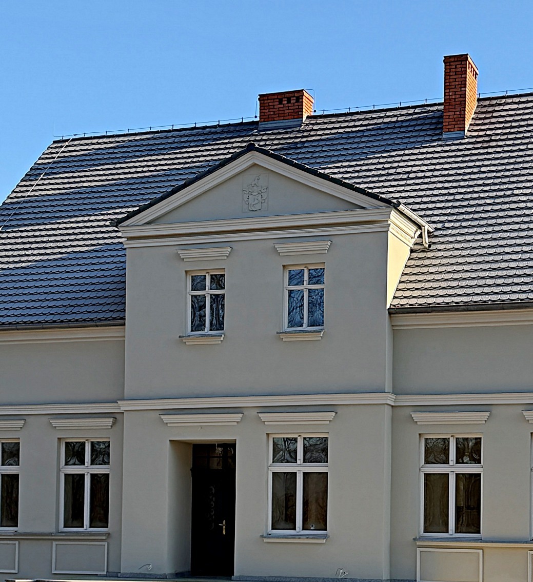 Der Wiederaufbau nach dem architektonischen Entwurf von Tomasz Jastrząb aus Posen erforderte eine enge Zusammenarbeit mit dem Denkmalschutzbeauftragten und die Verwendung traditioneller Materialien. Die Karpfenziegel, die Holzverkleidung und die erdigen Farben der Fassade wurden auf der Grundlage historischer Analysen ausgewählt. Das einzige neue Element der Umgebung wird der geplante Wintergarten sein, der so gestaltet ist, dass er den historischen Gutshof nicht dominiert.