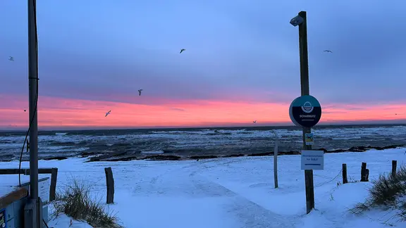 Sonnenaufgang in Scharbeutz: Dort schneit es noch nicht, aber der Wind weht schon ziemlich kräftig, berichtet NDR Reporter Hauke Bülow.