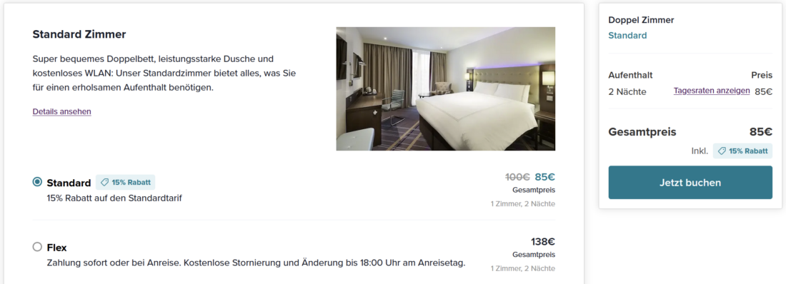 Ein Preisvergleich mit anderen Anbietern erübrigt sich, da die Buchung direkt bei Premier Inn nahezu immer günstiger ist als über Drittanbieter wie Booking.com. Kürzlich lagen die Einstiegspreise in Deutschland aber noch bei rund 50€ pro Nacht und im Rahmen der Aktion werden tatsächlich 15% abgezogen. So beispielsweise in Saarbrücken, wo ihr ein Doppelzimmer vom 20. bis 22. März für 85€ (= 43€ / Nacht) bekommt:
