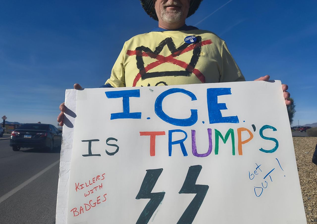 Ein Demonstrant in Pahrump (Nevada) mit Plakat: „Die ICE ist Trumps SS“, „Mörder mit Dienstmarken“ und „Verschwindet!“