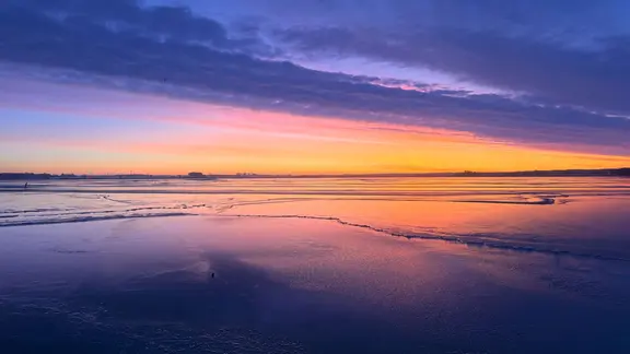 Lila- und organgefarbener Sonnenaufgang in einer Ostseebucht