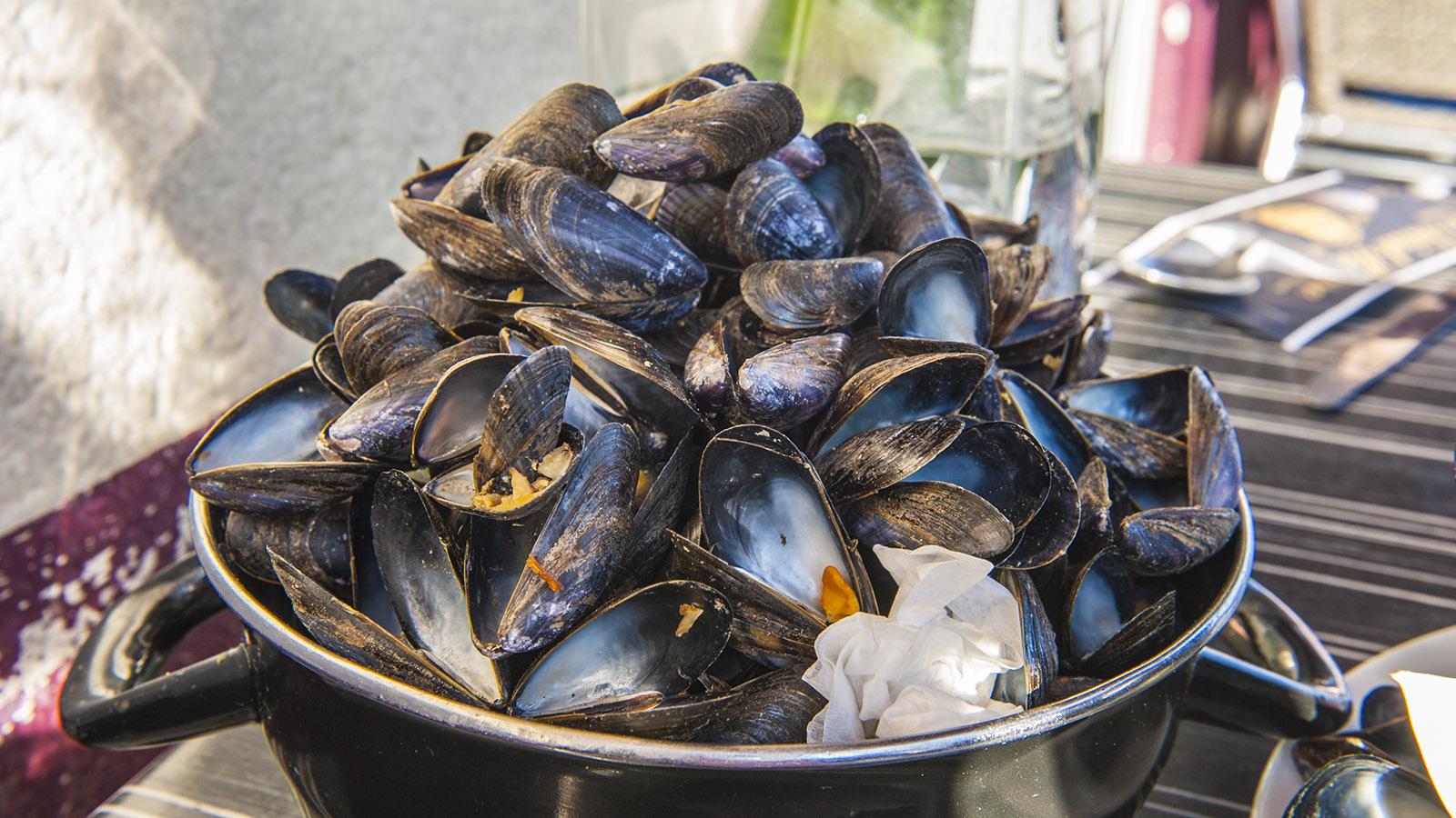 Moules, Miesmuscheln, gibt es in vielen Variationen in Frankreich – aber immer mit Pommes Frites. Foto: Hilke Maunder