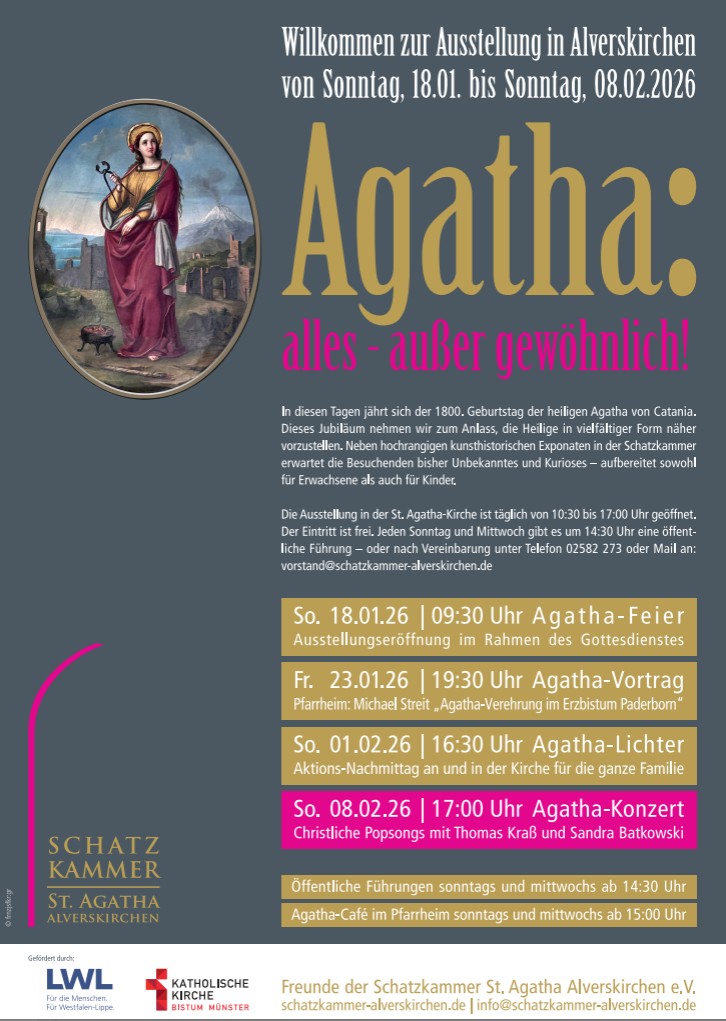 Unter dem Titel „Agatha: alles – außer gewöhnlich!“ eröffnen die „Freunde der Schatzkammer St. Agatha Alverskirchen“ am Sonntag, 18. Januar, eine Ausstellung zur heiligen Agatha von Catania. Anlass ist ein besonderes Jubiläum. Ihr Geburtsjahr wird in den Quellen um 225 nach Christus verortet – damit jährt sich ihr Geburtstag in diesen Tagen zum 1800. Mal.