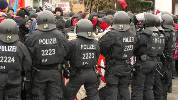 Rund 500 Gegendemonstranten hatten sich am Sonntagmittag vor dem Veranstaltungsort in der Christianstraße versammelt. Unter anderem hatte das zivilgesellschaftliche Bündnis „Runder Tisch für Toleranz und Demokratie Neumünster“ zu einer Kundgebung aufgerufen. Auf Plakaten stand zum Beispiel „Nie wieder ist jetzt“. Am Nachmittag löste sich die Kundgebung auf.