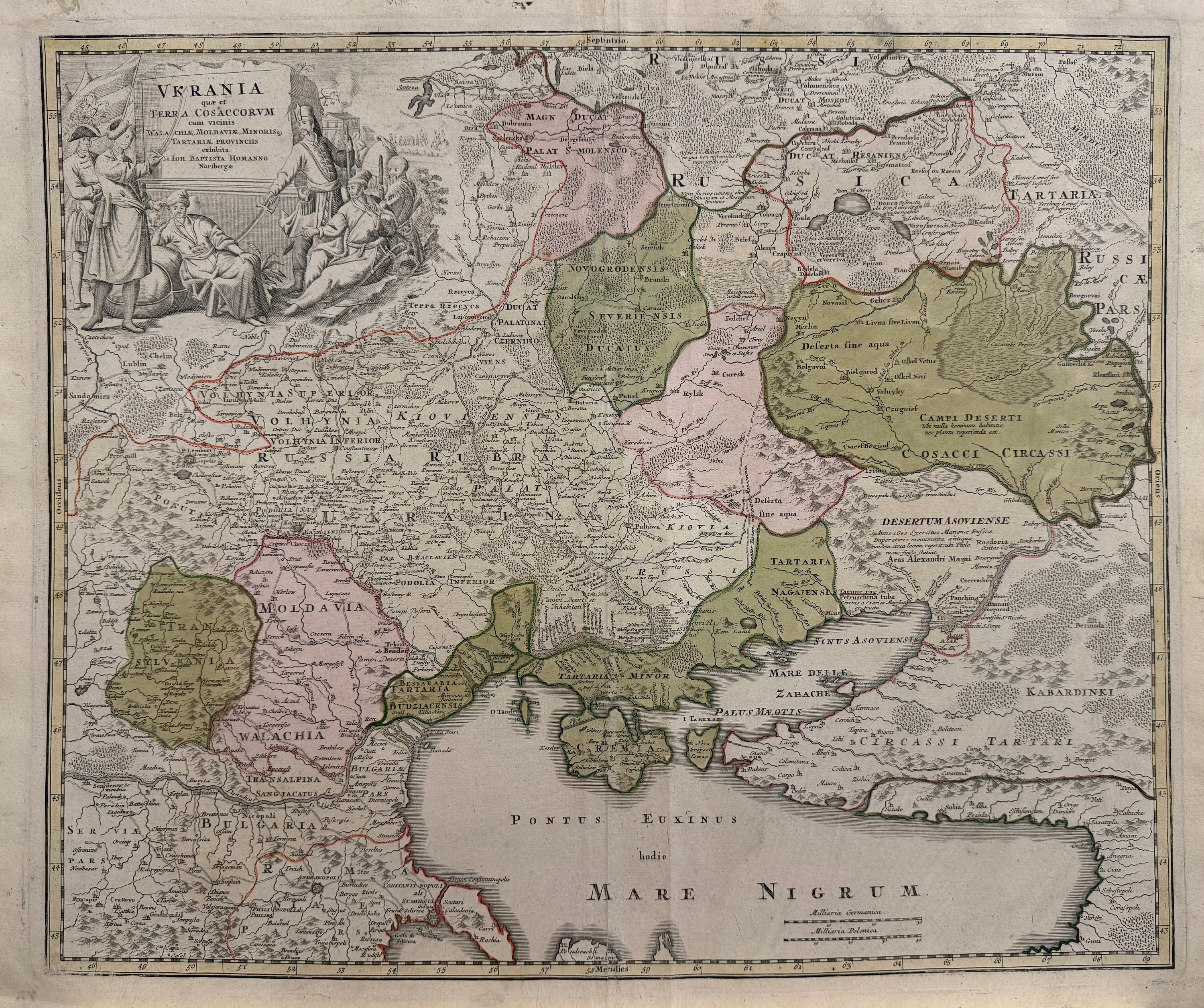 Ein Kupferstich von Johann Baptist Homann aus dem frühen 18. Jahrhundert zeigt eine historische Karte, in der die Ukraine und die Kosakengebiete eingezeichnet sind.