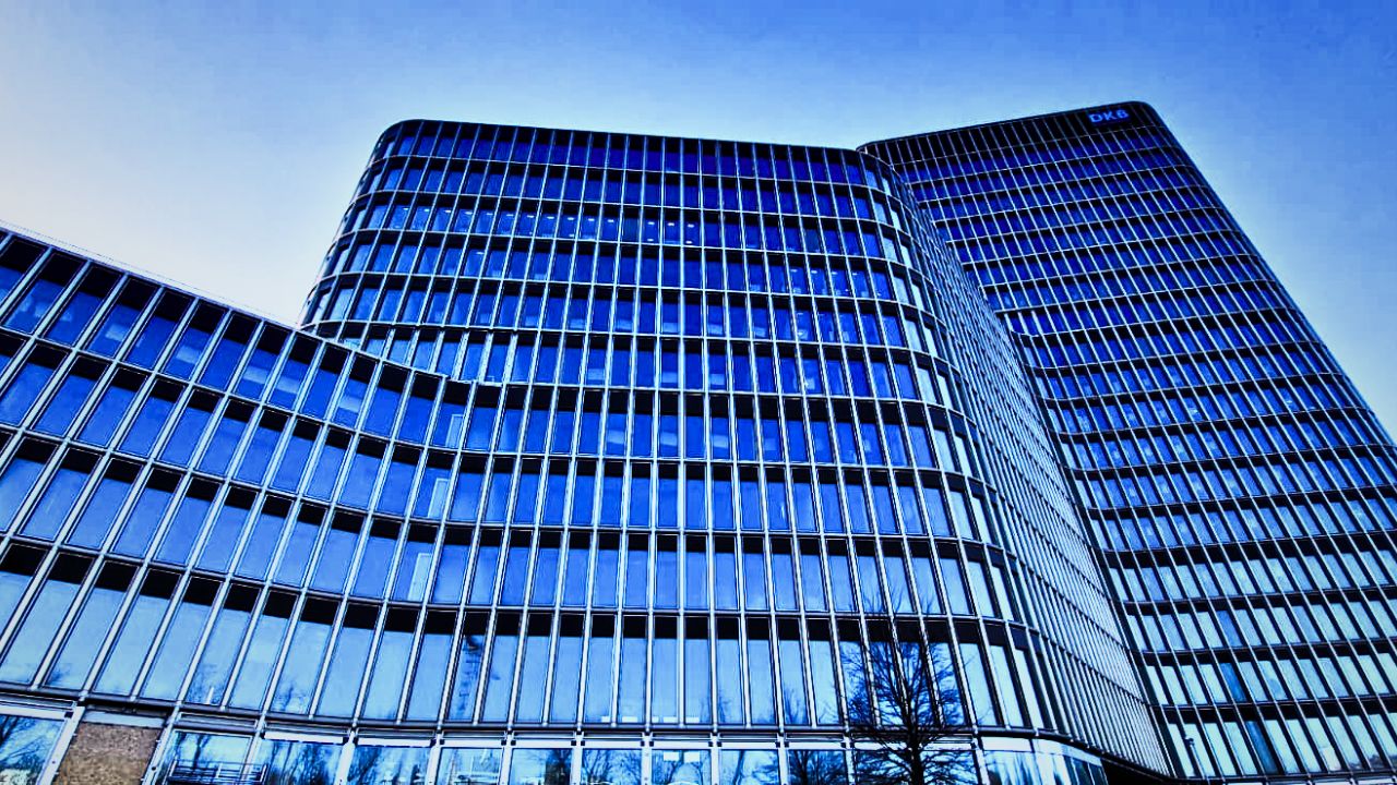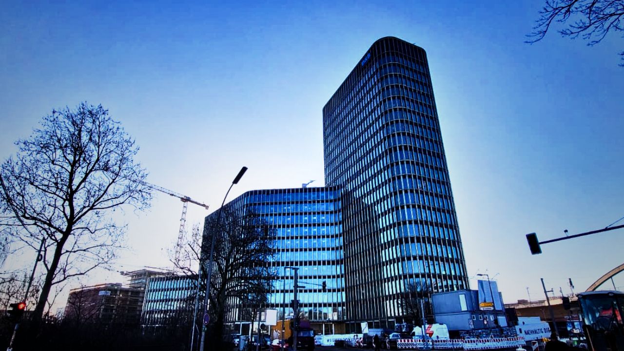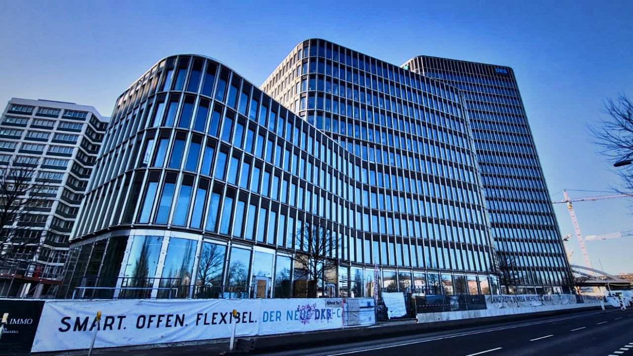 Nur wenige Meter entfernt entwickelt die Optima-Gruppe mit „Port One“ einen Hochhauscampus, der neben Büroflächen auch eine Kita sowie begrünte Dachflächen integriert. Auch hier prägt Glas das Erscheinungsbild: Die Fassaden zeigen sich transparent, geometrisch und konsequent modern. Mehrere Baukörper bilden ein zusammenhängendes Ensemble, das trotz seiner Größe eine gewisse Leichtigkeit ausstrahlen möchte.