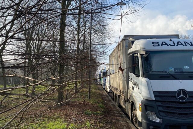 Die Hunderte Meter lange Lkw-Reihe im Emscherbruch ist eine Sache, der Müll, der in den Grünstreifen (links) fliegt, eine andere. © Joachim Schmidt
