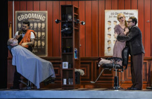 Es geht wie in allen erfolgreichen Komödien um Liebe, Macht und Geld, und in diesem Fall um die überlegene List der jungen, reizenden Rosina, des findigen Figaro und des verliebten Almaviva. Der alte Doktor Bartolo will seine Nichte Rosina heiraten, weil er scharf auf ihr Geld ist, aber der junge Student Lindoro alias Startenor Almaviva kommt ihm mit Hilfe des listigen Barbiers Figaro zuvor. Der mit Geld geschmierte Priester, Notar und Musiklehrer Basilio verheiratet am Ende Rosina in Bartolos Haus mit Almaviva. Der junge südafrikanische Regisseur Matthew Wild, dessen Tannhäuser-Inszenierung in Frankfurt 2024 zur Aufführung des Jahres gewählt wurde, holt die Handlung in die Gegenwart und verlegt sie mittels einer Video-Projektion in die Bonner Altstadt, wo Don Basilio direkt neben Figaros Barber Shop eine Zahnarztpraxis betreibt. Ein Assistent im Zahnarztkittel deutet an, dass hier Zähne behandelt werden. Rosina muss im weißen Kittel assistieren.