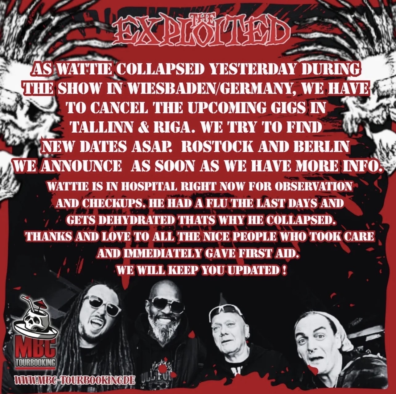 Bei der Show von THE EXPLOITED in Wiesbaden am 31.1.26 brach der Sänger noch während des ersten Songs „Let’s Start A War“ zusammen. Wie Augenzeugen berichten, wurde er sogleich medizinisch versorgt und ins Krankenhaus gebracht. Der Konzertabend wurde unterbrochen, bis es aus dem Krankenhaus Entwarnung gab, dass Wattie bei Bewusstsein und ansprechbar sei. Im Anschluss ging es wie geplant mit SLIME als Headliner weiter.