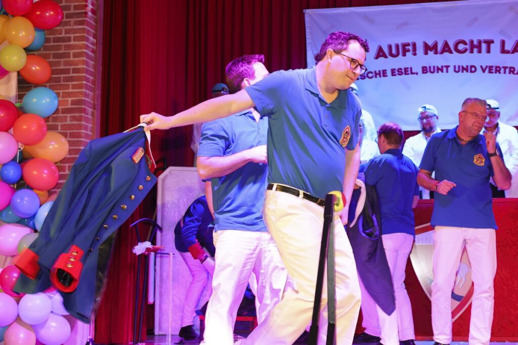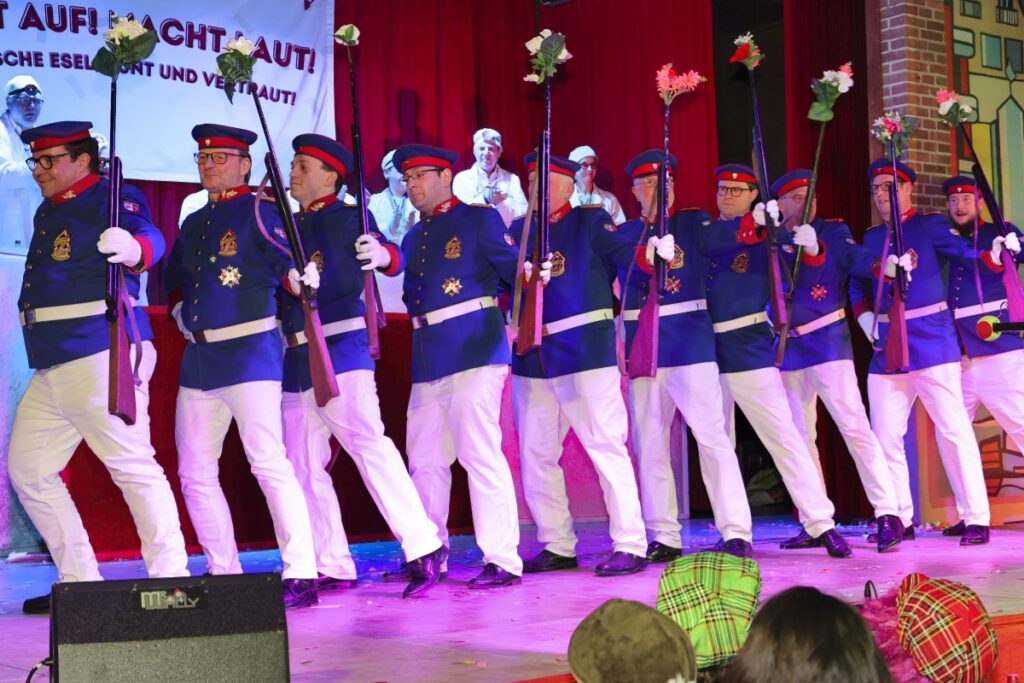 Direkt anschließend zogen die Rösige Penn auf, die Garde des Prinzen. Wer neu in der Halle der Wichernschule war, mochte kurzzeitig an einen steifen Herrengarde-Tanz denken – doch weit gefehlt. Angeführt vom Präsidenten Roland Becker warfen die Herren ihre Uniformjacken ab – und legten eine Super-Performance aufs Parkett.
