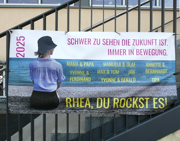 Prognosen auf den Bannern der Abiturientinnen beim Aufgang zur Aula, Foto: Petra Kammann