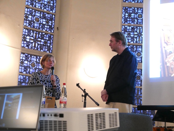 Gabriele Fachinger, Bibliothekarin & Literaturpädagogin der St. Angela-Schule, im Gespräch mit dem Autor, Foto: Petra Kammann