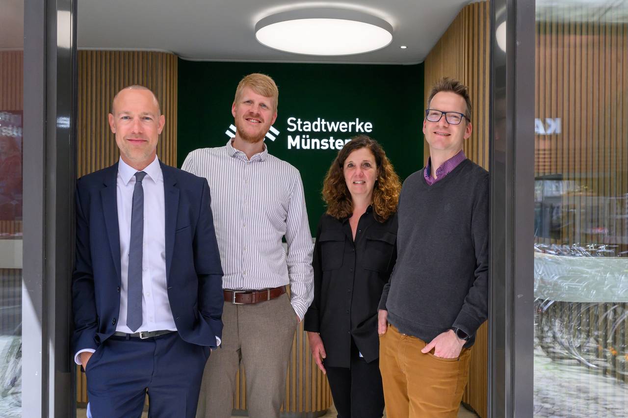 Die Stadtwerke beraten wieder im Herzen von Münster (v.l.n.r.): Stadtwerke-Geschäftsführer Sebastian Jurczyk, Simon Sanchez Real, Abteilungsleiter Privatkunden Vertrieb und Vertriebssteuerung, Stefanie Gaasch, Projektleiterin Bau- und Infrastrukturmanagement, und Manuel Schepers, Teamleiter Servicepunkt Innenstadt.