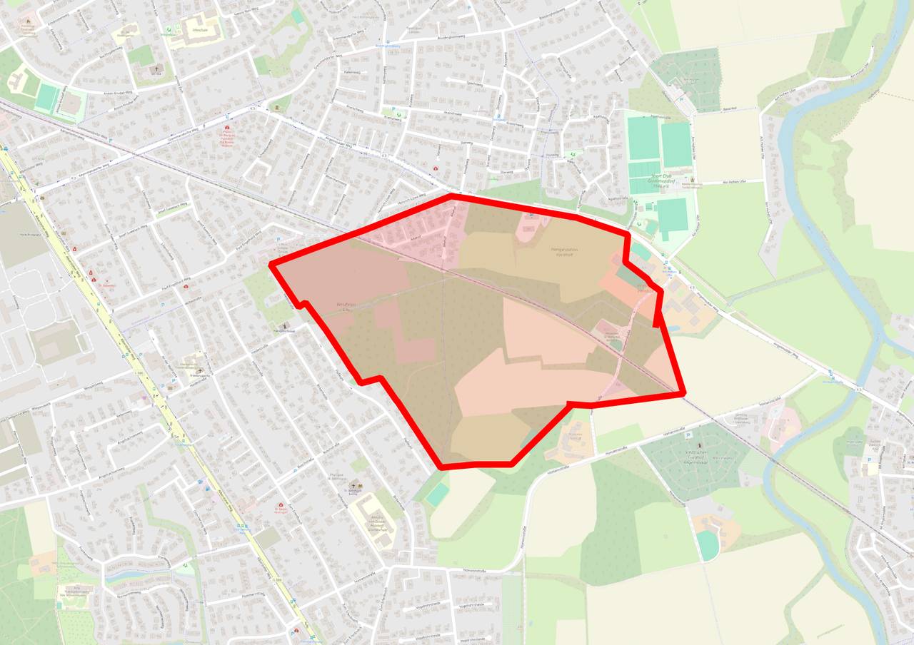 Am Angelmodder Weg ist am Mittwoch, 7. Mai, ein Blindgänger gefunden worden. Die Feuerwehr sperrt und evakuiert das Gebiet in einem Radius von 250 Metern um die Fundstelle.© Stadt Münster/OpenStreetMap-Beitragende