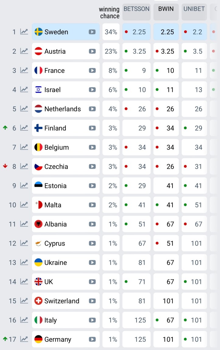 Wettquoten ESC 2025: Überblick , Stand 09.05.25 / 17:20 Uhr