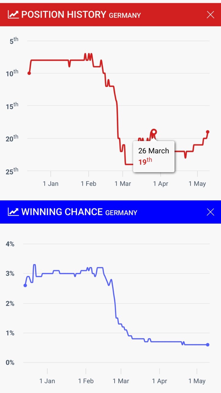 Die restlichen Big-5-Nationen, die gestern probten, haben wenige Veränderungen bei den Buchmachern erlebt. Lediglich Melody aus Spanien konnte mehrere Plätze in den vergangenen Tagen gut machen und hält sich auch nach ihrer Probe auf dem 18. Platz, was verglichen mit den spanischen Siegeschancen Ende Februar ein riesiger Fortschritt ist. Damals sahen die Buchmacher sie zwischenzeitlich sogar auf dem 36. und somit vorletzten Platz.