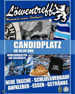 Zum Heimspiel gegen den VfB Stuttgart II gibt es ab 10.30 Uhr wieder einen Löwentreff am Candidplatz. Als Verpflegung gibt es Wiener mit Kartoffelsalat und Semmel und zum Trinken das Übliche. Des Weiteren gibt es eine neue bestickte Umhängetasche zum Kaufen und zudem einen großen Ausverkauf vieler verschiedener Restartikeln.