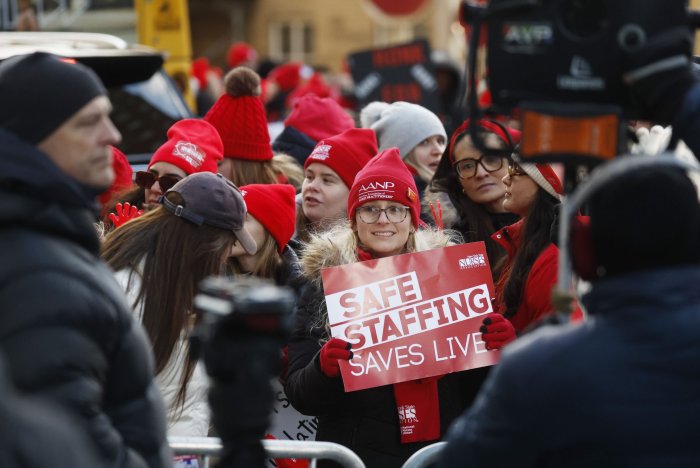 Picketers hold signs outside at the entrance to Mount Sinai Hospital on Monday in New York City. Nearly 15,000 nurses across New York City are now on strike after no agreement was reached ahead of the deadline for contract negotiations. It is the largest nurses’ strike in NYC’s history. The hospital locations impacted by the strike include Mount Sinai Hospital, Mount Sinai Morningside, Mount Sinai West, Montefiore Hospital and New York Presbyterian Hospital. Photo by John Angelillo/UPI | License Photo
