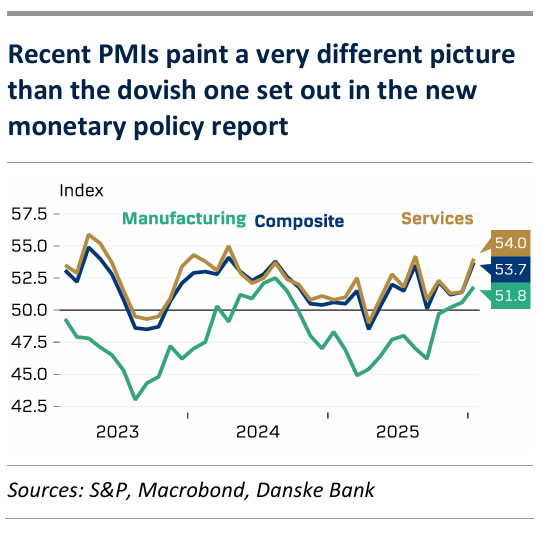 In its monetary policy report, the new BoE outlook has a more dovish tone with both GDP and inflation forecasts lower and unemployment higher compared to November. CPI Inflation is now expected at 1.7% in 2027Q1 vs. 2.2% in the November report, while annual GDP growth has been revised 0.3pp lower to 1.2%. We highlight that recent PMI data had a particularly more hawkish flavour, with composite PMI at its highest level in three years and price indices suggesting more sustained inflation pressures. Upcoming data will judge what to make of this.
