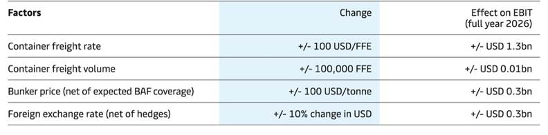 Maersk’s financial performance in 2025 depends on several factors and is subject to uncertainties related to macroeconomic conditions, bunker prices and ocean freight rates. All else being equal, sensitivities for 2025 related to four key assumptions are outlined in the table below.