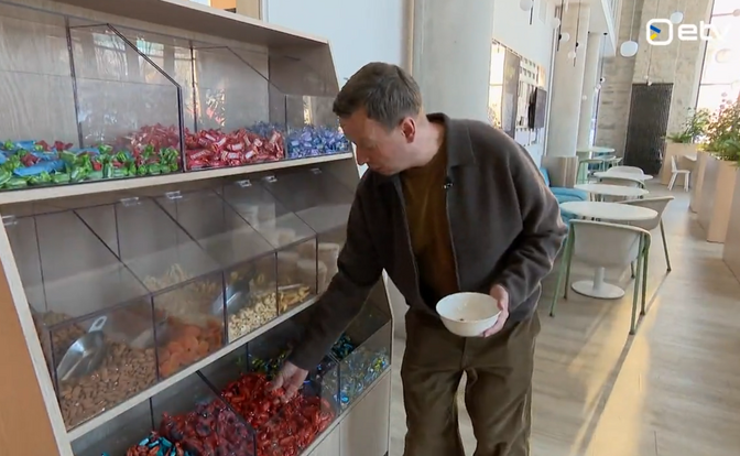 ‘Ringvaade’s’ Marko Reikop helps himself to some of the free nuts and chocolates on offer to Wise staff. Source: ERR