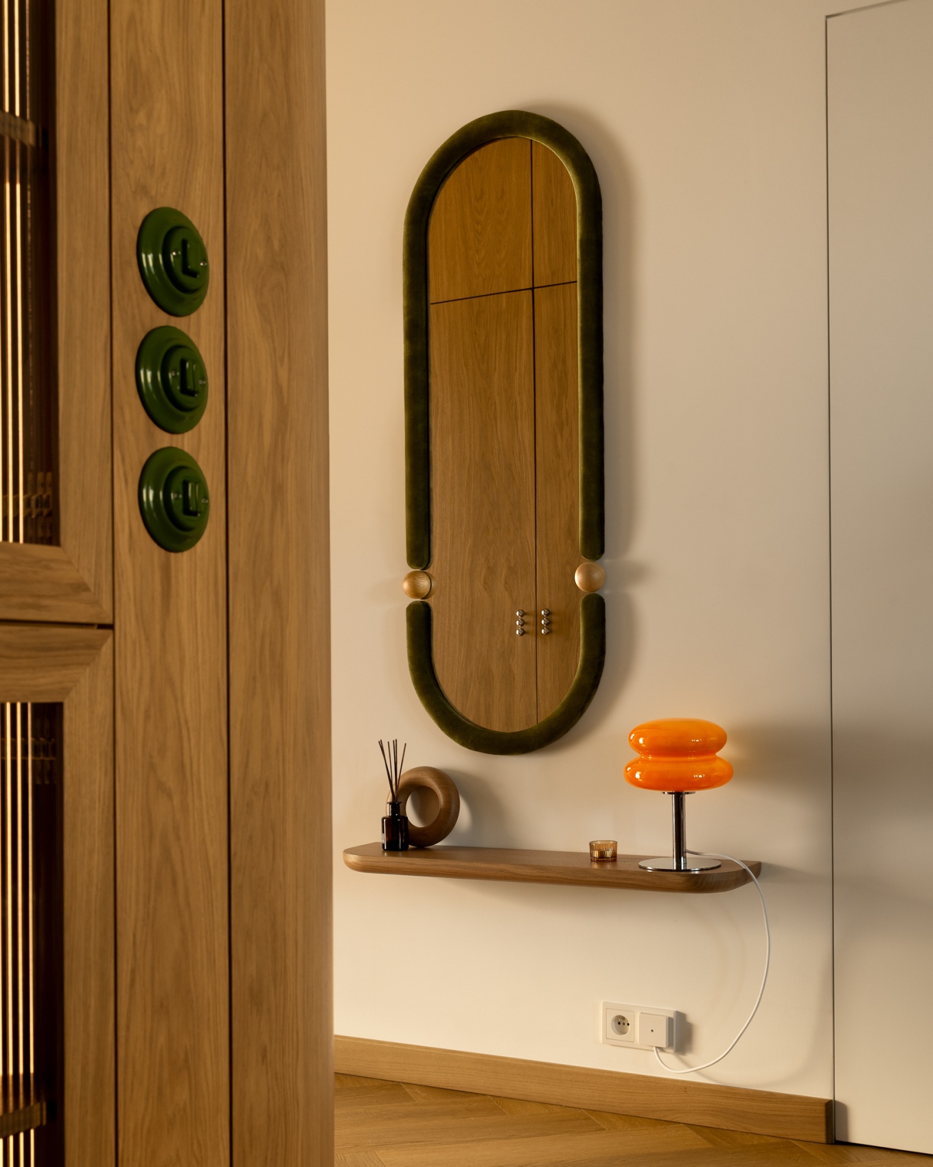 Nothing in this flat is accidental. The wood has the same shade in every room, the upholstery is repeated on different surfaces, and the same tiles and worktops connect the kitchen and bathroom. All the fixtures and fittings were made to order, as were the doors, mirrors and bed. Even the two paintings in the living room were painted by the architect especially for this interior, completing the story of full creative control over the design.