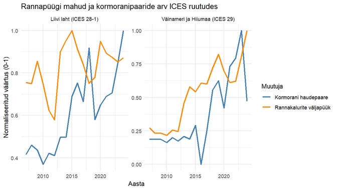 Joonis 1. Rannapüügi mahtude muutused läbi aastate Liivi lahel ja Väinamerel koos kohalike kormoranipopulatsioonide muutustega. Mõlema andmerea väärtused (tonnid ja haudepaaride arv) on pandud samale suhtelisele skaalale, et muutuste kõverad oleksid lihts Autor/allikas: Põllumajandus- ja toiduamet, keskkonnaagentuur