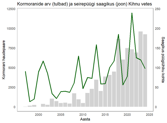 Joonis 3. CPUE ehk saak standardse nakkevõrkude jada kohta ühe püügiöö jooksul (roheline joon) näitab Kihnu seirealal selget tõusutrendi. Ka kohaliku kormoranipopulatsiooni suurus (hallid tulbad) näitab tõus Autor/allikas: Tartu Ülikooli Mereinstituut, keskkonnaagentuur