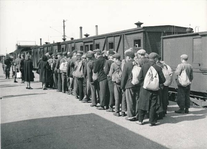 Mobiliseeritud eestlased Balti jaamas 17. augustil 1944. Autor/allikas: Ilja Pähn, TM F 1038:37, Tartu Linnamuuseum, http://www.muis.ee/museaalview/1356051