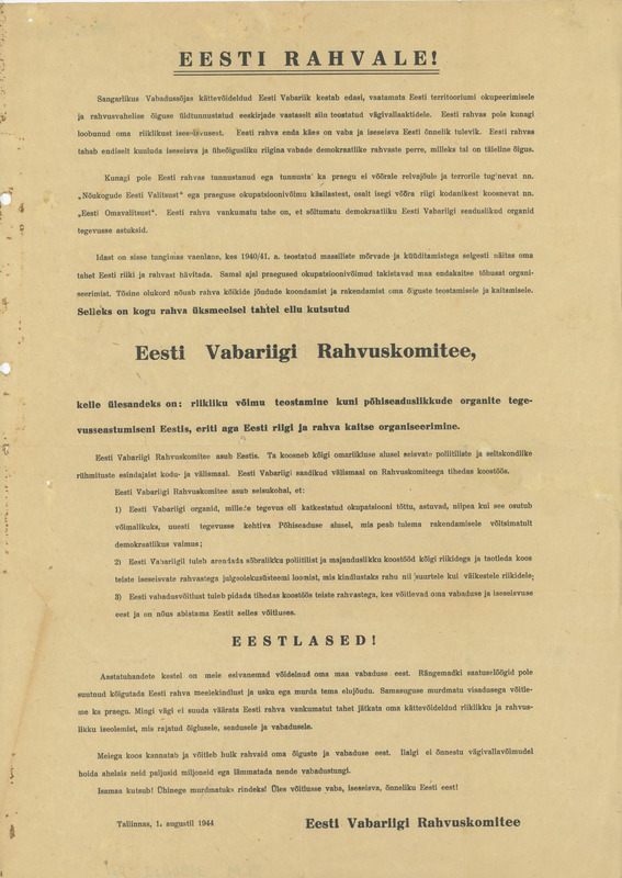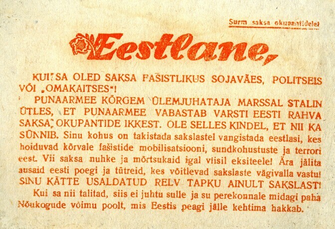 Nõukogude lendleht, mis kutsub politseis ja omakaitses teenivaid eestlasi, mitte jälitama end Saksa võimude eest varjavaid inimesi. Autor/allikas: RM _ 1866 Ar1 190:1, Virumaa Muuseumid SA, http://www.muis.ee/museaalview/2756391