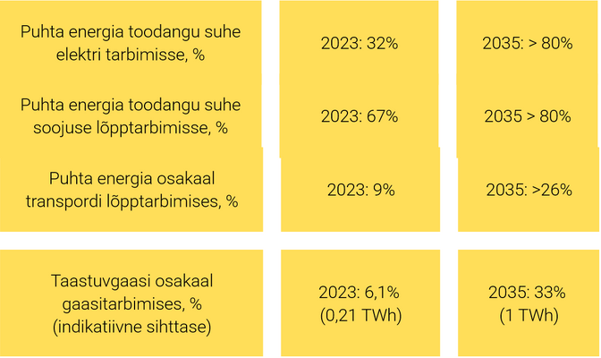 Alaeesmärgina on ENMAK-is kirjas, et puhta energia toodangu suhe elektri tarbimisse peab aastaks 2035 olema vähemalt 80 protsenti. Aastal 2023 oli see Eestis 32 protsenti. Praegu kehtivas ENMAK-is on aastaks 2030 nõutud taastuvenergia osakaaluks lõpptarbimises aastal 2030 50 protsenti.