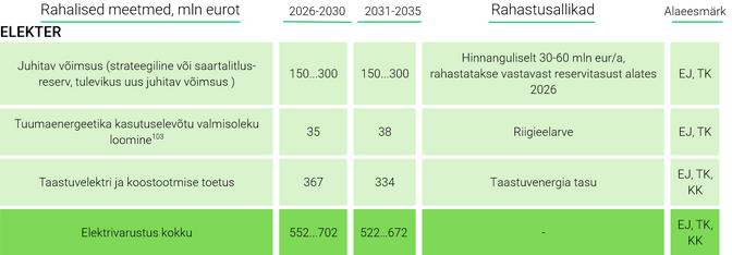 Et tagada arengukava perioodi 2026–2035 eesmärgid ehk energiavarustuskindlus ning taskukohane ja konkurentsivõimeline energia hind, on vaja investeerida 5,4 kuni 10,1 miljardit eurot ning rakendada riiklikke meetmeid kokku 1,2 kuni 1,5 miljardi euro ulatuses, märgib ENMAK. “ENMAK 2035 rakendamisega seotud kulud kaetakse Eesti taastekava, struktuurivahendite, võrgutasude ja taastuvenergia tasu jms kaudu,” seisab arengukavas.