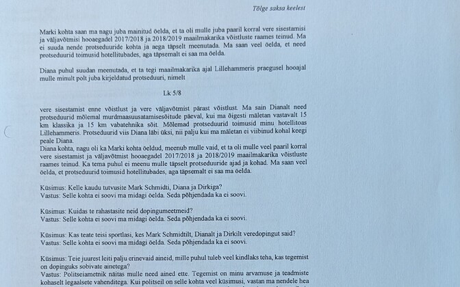 Kui ma õigesti mäletan, toimus see vere sisestamine kunagi hommikul. 15 km klassikasõidu päeval praegusel (2019. aasta – toim) MM-il Seefeldis tegi mulle Diana enne võistlust vere sisestamise. Plaanitud vere väljavõtmine jäi ära, kuna vahepeal oli meie korterisse sisenenud politsei. Sisestamise teostas Diana üksi jällegi korteris kortermajas ROSIMO. Teiste isikute kohalviibimise kohta ei soovi ma jällegi midagi öelda.