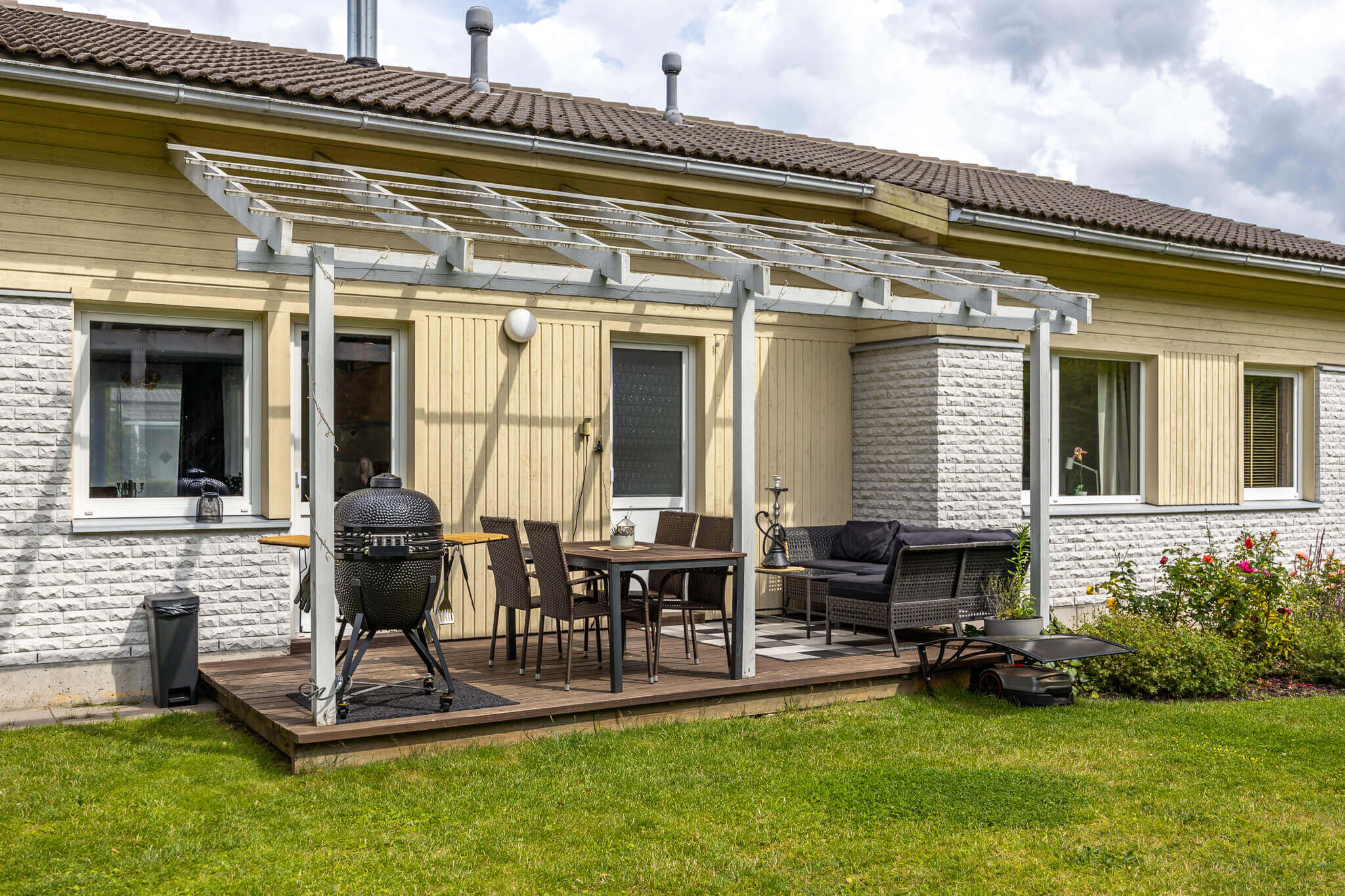 Kui Tabasalu elanikud Fredi ja Helena soovisid enda terrassi värskendada tuli lahendada neil keeruline mõistatus: kuidas tekitada piisaval hulgal mugavaid istekohti sagedasteks pannkoogihommikuteks ja saunaõhtuteks sõprade ja pere ringis? Paarikese katuseta olev aiaterrass, kaunistuseks ainult jõulutuled ja üks seinalamp, ei andnud kuidagi nende unistuste õueala mõõtu välja.