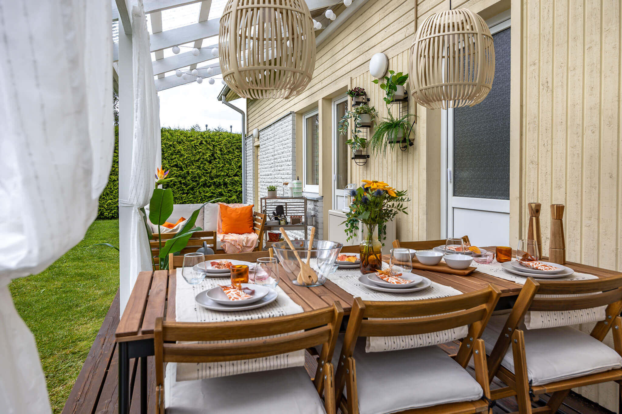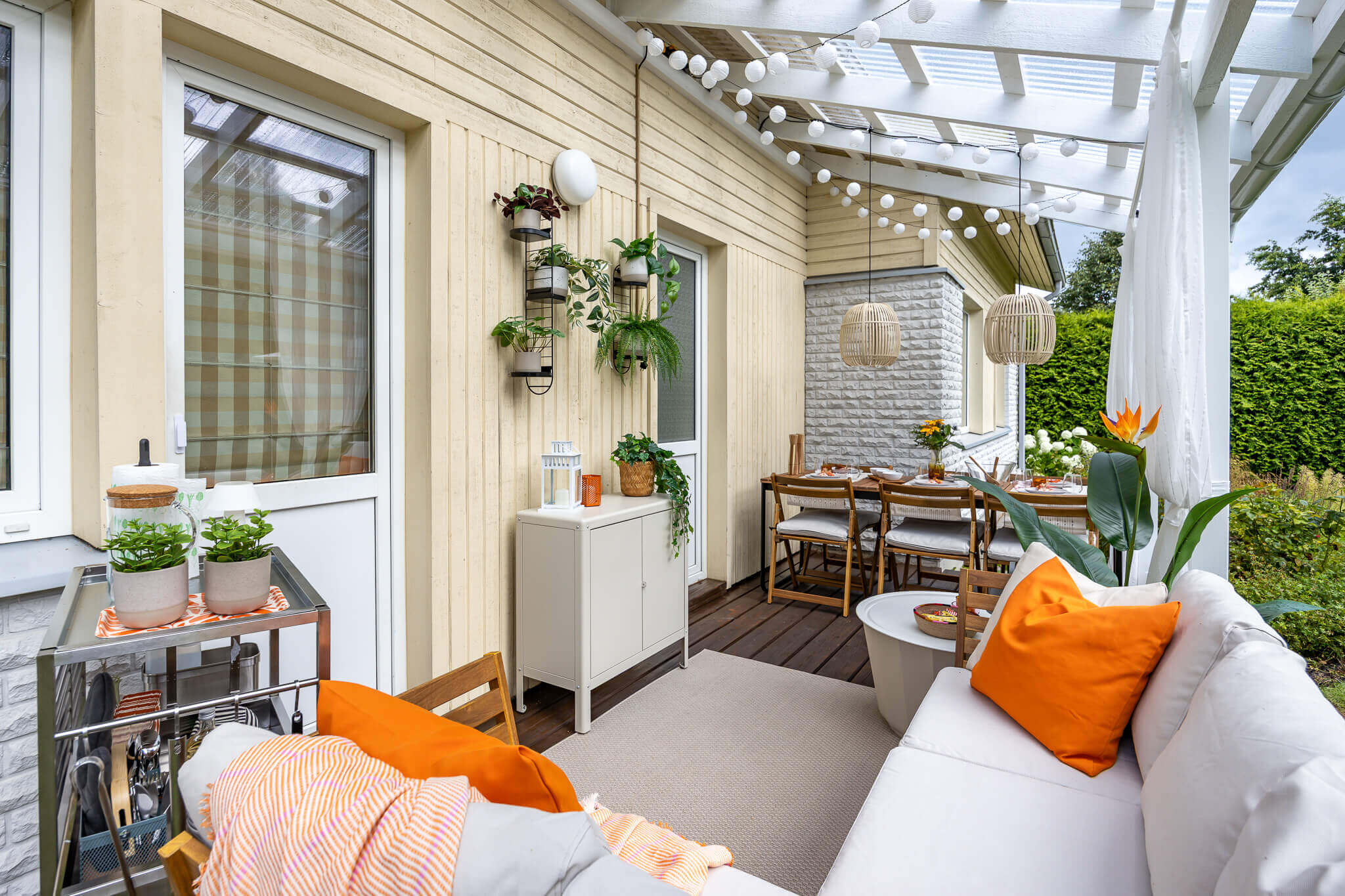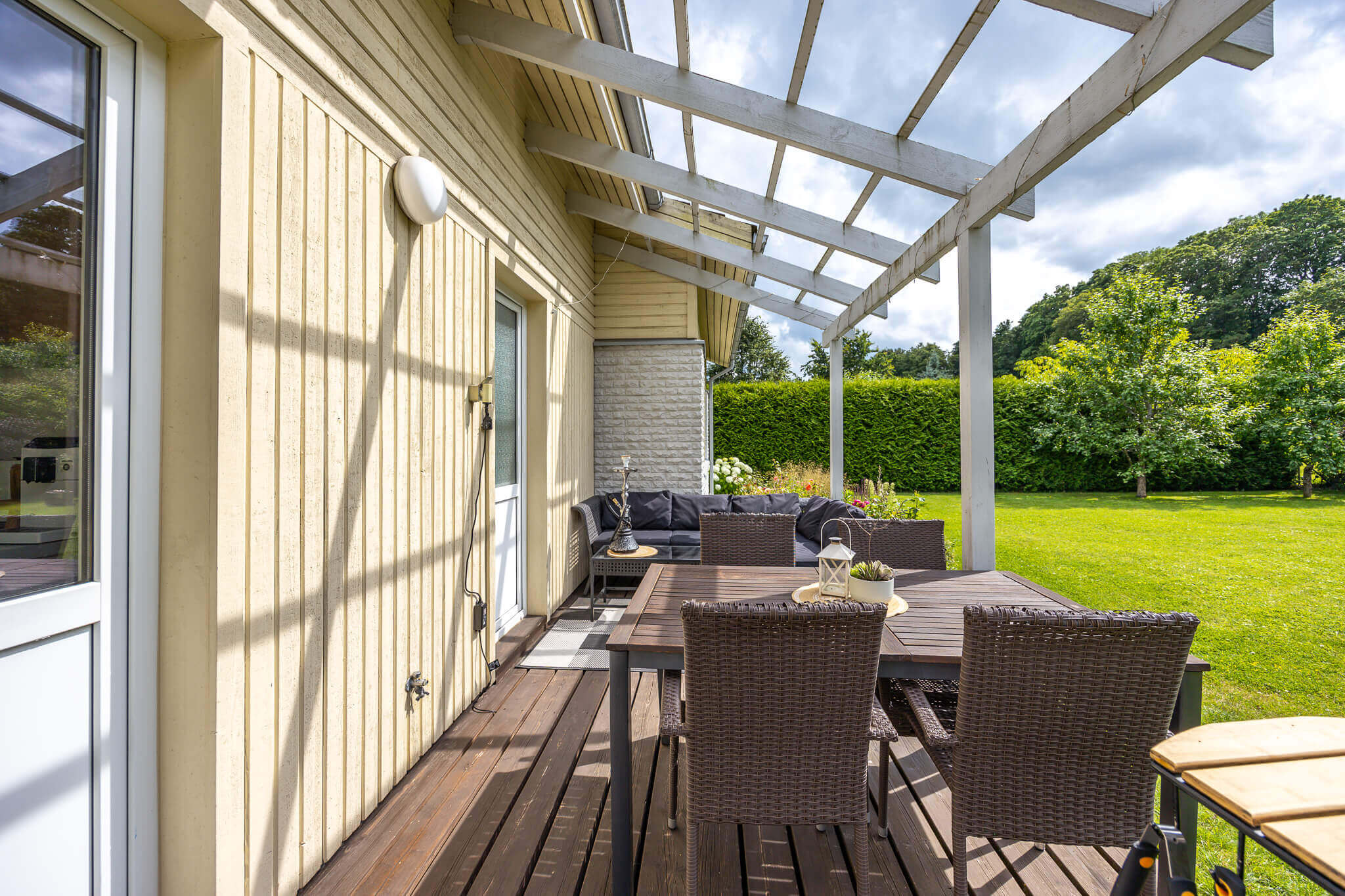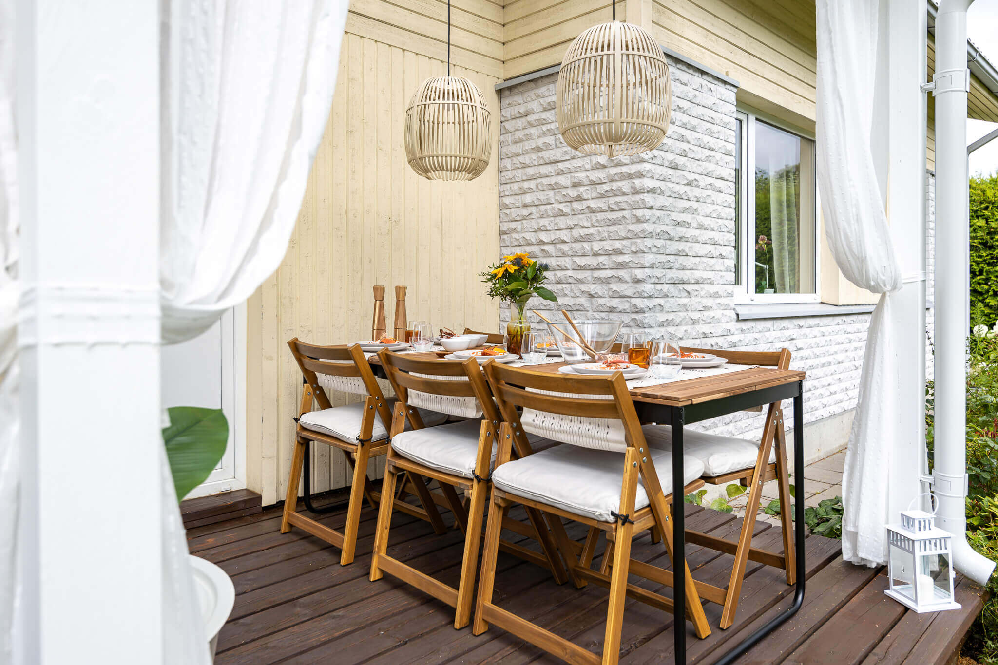 Erinevaid valgusallikaid sai kombineeritud ka Fredi ja Helena terrassil: päikeseenergial töötavad LED-valgusribad lae all loovad pehme taustavalgustuse, söögilaua kohale riputatud meeleoluvalgustid toovad fookuse õigesse kohta ning küünlad ja laternad lisavad hubasust.