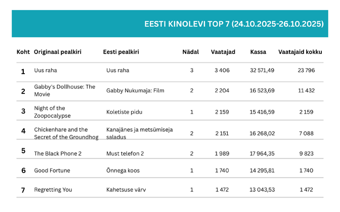 Möödunud nädalavahetusel oli Eesti kinodes taas kõige populaarsem Rain Rannu mängufilm “Uus raha”, mis on kolme nädalaga kogunud 23 796 külastust.