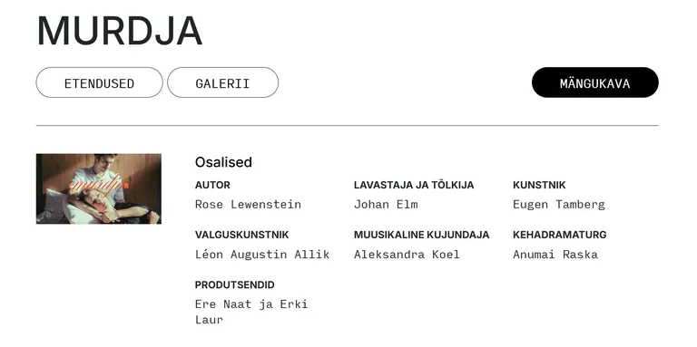 Kõnealuse tüki lavastaja ja tõlkija on Johan Elm, etenduse juht Elis Listra ja produtsendid Ere Naat ja Erki Laur.